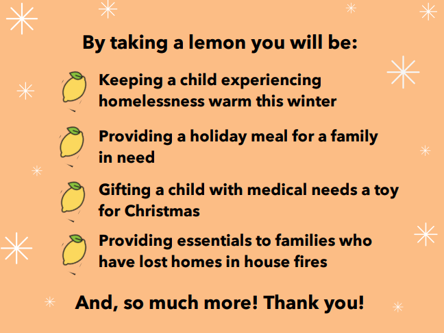 Looking for a great holiday activity for you and your co-workers? Consider participating in Payton’s Lemonade Stand Lemon Giving Tree program this season! We will provide your company with giving tree – either a physical tree for your office, or a virtual tree on our website! Your employees can choose the gift they would like to purchase, shop throughout the holiday season, and we will pick up the items in time to give to some needy kids this holiday season.